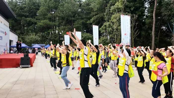 活动进行第三项,健身教练带领大家做热身操,避免在比赛过程中受伤。